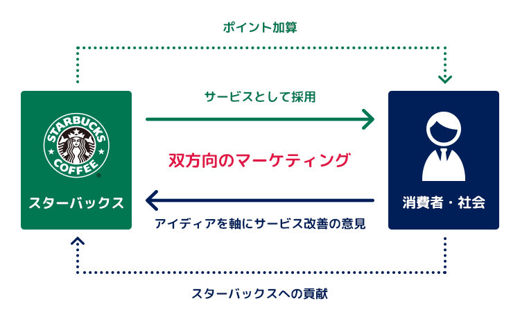 「My Starbucks Idea」を提供しており、スターバックスと顧客、あるいは顧客同士がアイデアをベースにサービス改善のための意見交換を行っており、その中で優れたアイデアは実際にサービスとして採用されます。積極的に参加をすることでプロフィールにポイントが加算されていく仕組みになっていて、顧客がいかに自分がスターバックスに貢献しているかを確認できるようにもなっています。